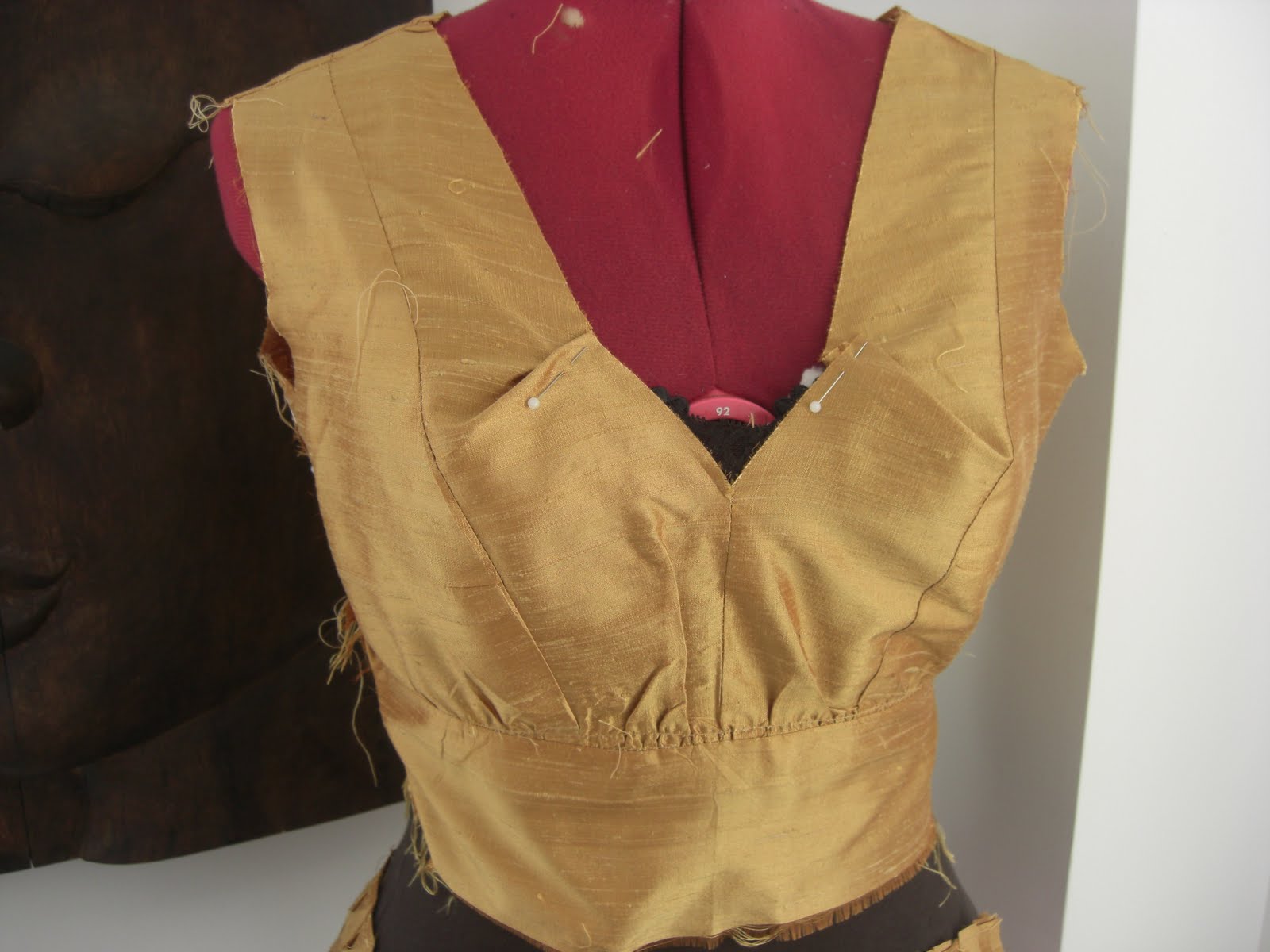 I made up a muslin of the Hot Patterns dress bodice, starting with a 12 and adjusting the back so that it wasn't so low. It looked very cute, but was a complete mess when I tried it on. Feeling a bit despondent I went back to the sewing room, took it apart and then realised that I had put it on backwards! Sewed it back up again and what do you know, so much better! I just need to take out some excess fabric in the front neckline (you can see it pinned out in the photo below - I've adjusted the pattern in several small areas rather than one large dart like this though). I know it seems rather extravagant to make a muslin from silk, but I have loads of this leftover from last years bridesmaid project.